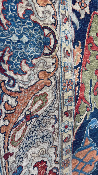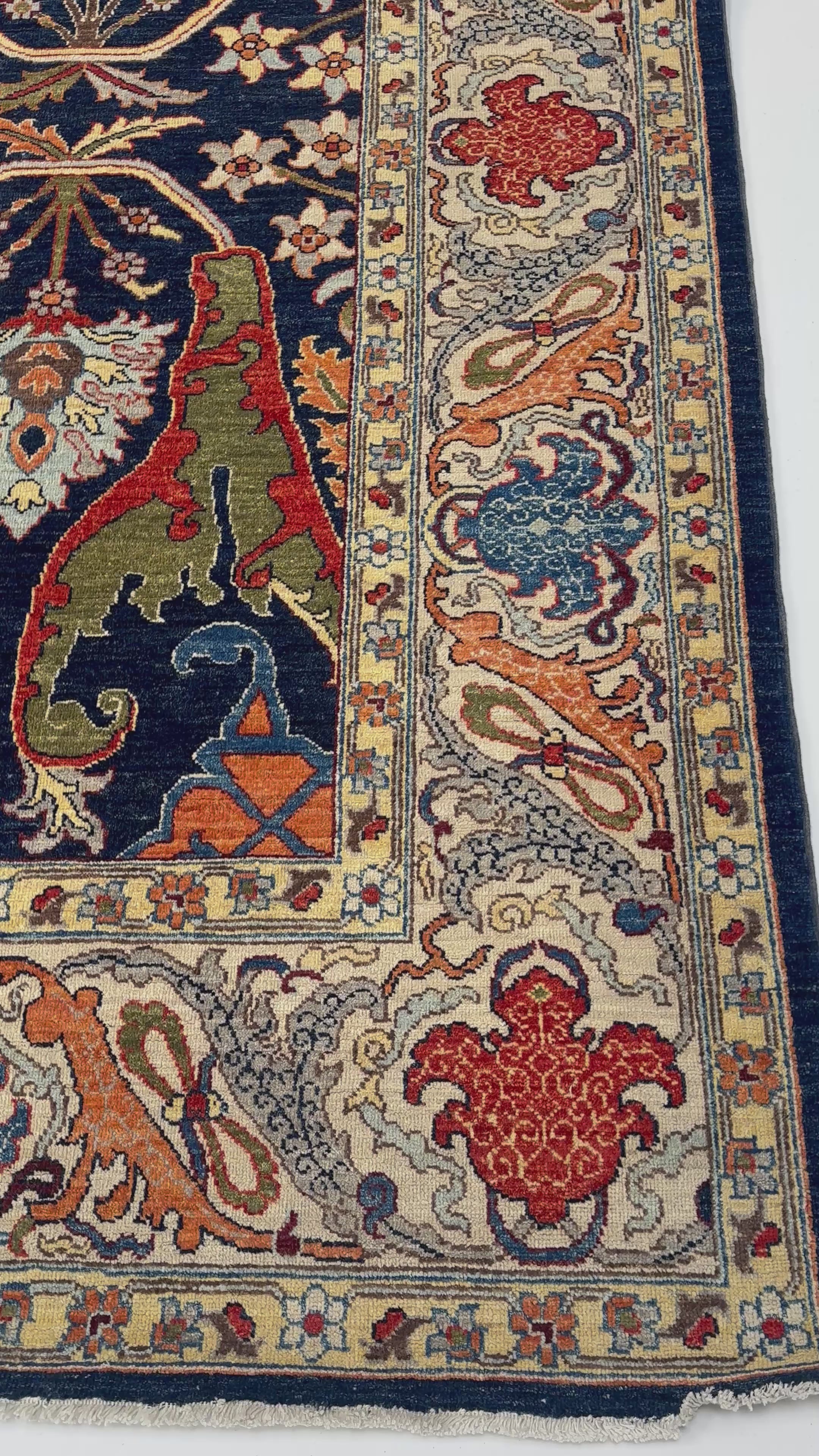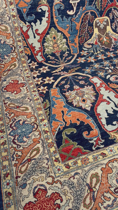 The surrounding border introduces ornate detailing that frames the central field with contrast and precision, enhancing the carpet’s sense of structure without overpowering it. Subtle variations in pile and tone reveal the handwoven process, adding complexity and authenticity to the surface.