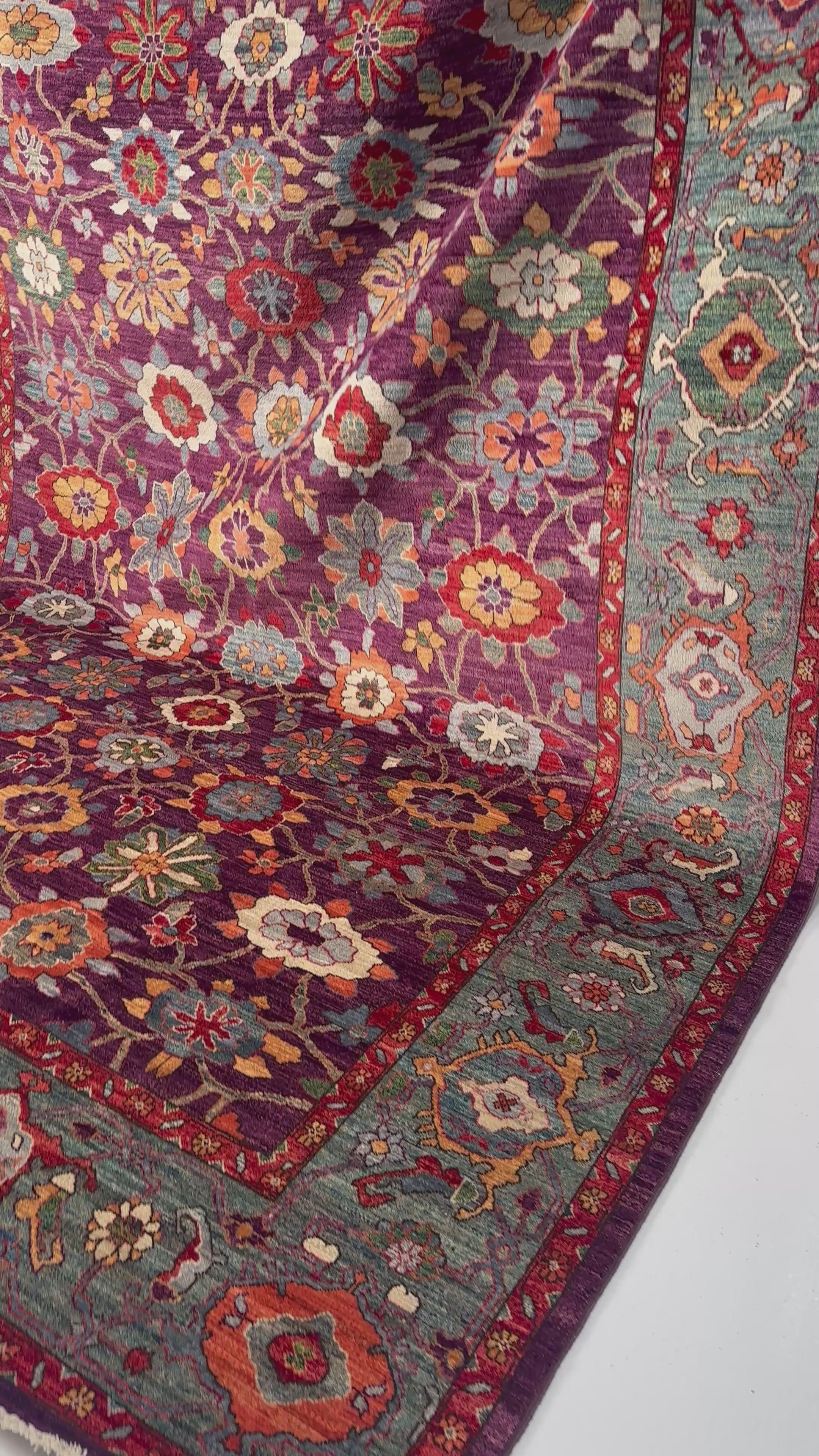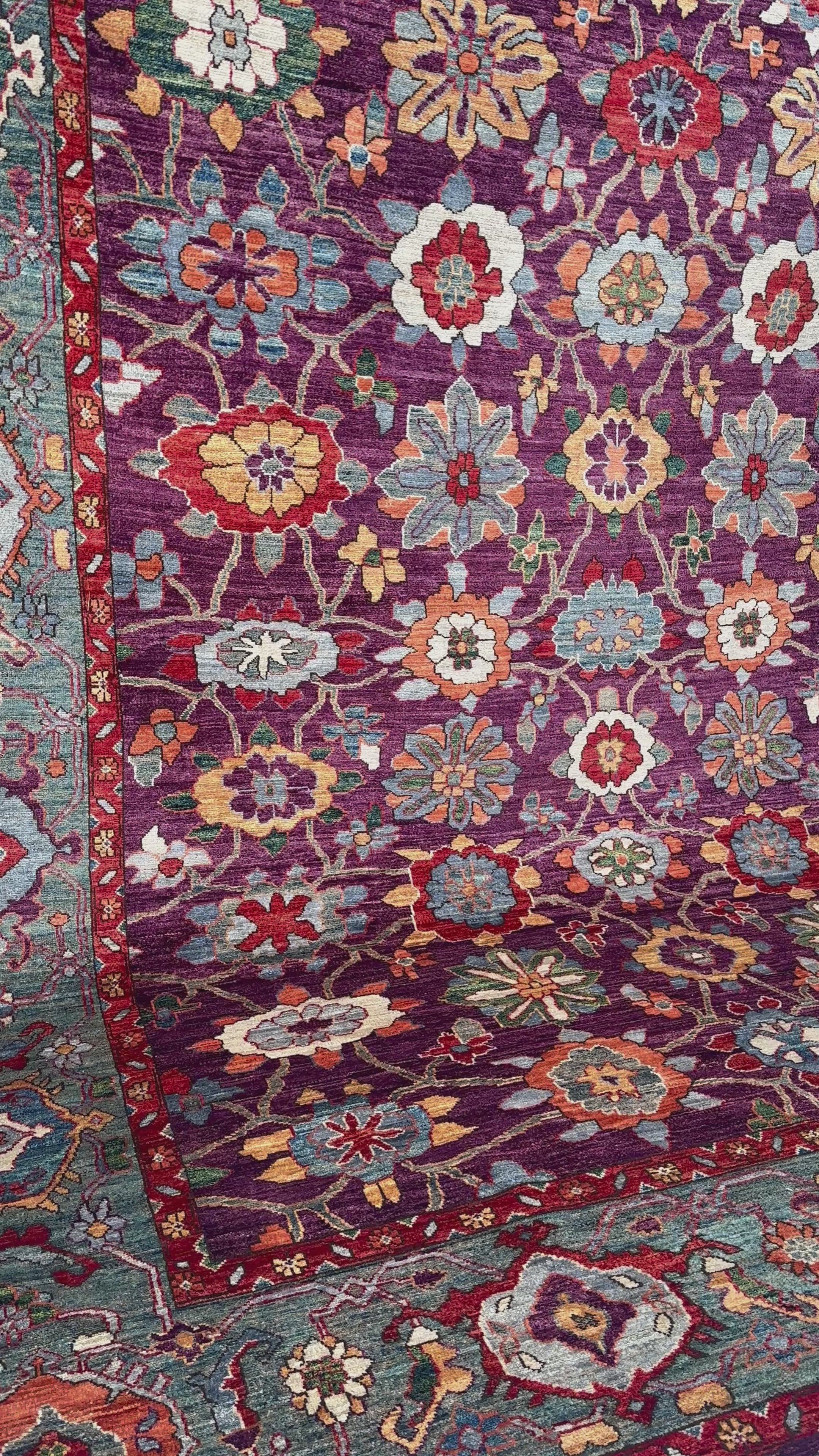 A contrasting border in cool turquoise tones frames the interior with balance, introducing structure while echoing the palette within. Slight variations in hue and knot density reveal the handwoven nature of the piece, giving it depth and individuality.