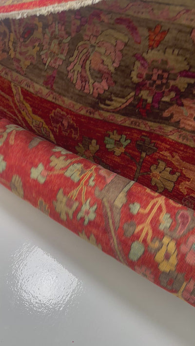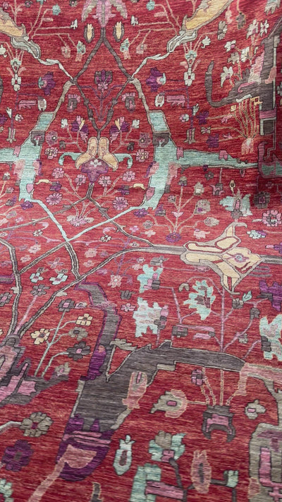 The surface carries a subdued ember-red ground, infused with tones of smoked rose, muted brick, pale clay, soft pistachio, and shadowed charcoal. The design unfolds through interlocking lines and symbolic forms that feel intentional and deliberate, creating a quiet visual tension rather than overt decoration. Motifs emerge and recede across the field, giving the piece a sense of internal structure and measured flow.