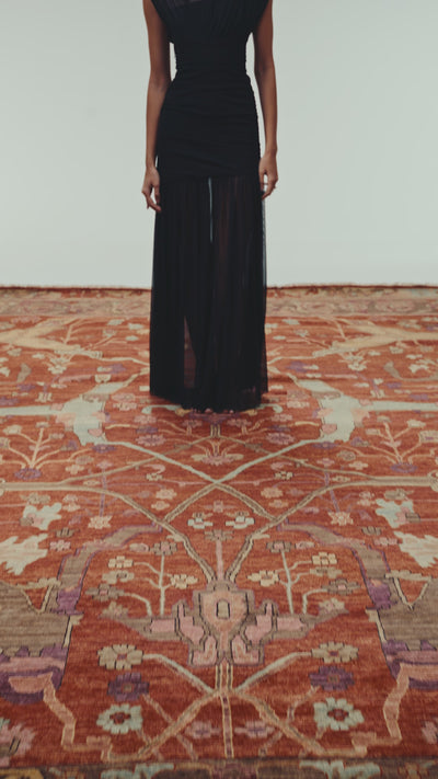 Silent Ember is a restrained yet powerful composition, defined by depth, rhythm, and meticulous handcraft. Entirely handmade by skilled artisans, this carpet is woven from 100% natural wool sourced from Pakistan and New Zealand, selected for its robustness, tactile comfort, and ability to hold layered colour with subtlety.