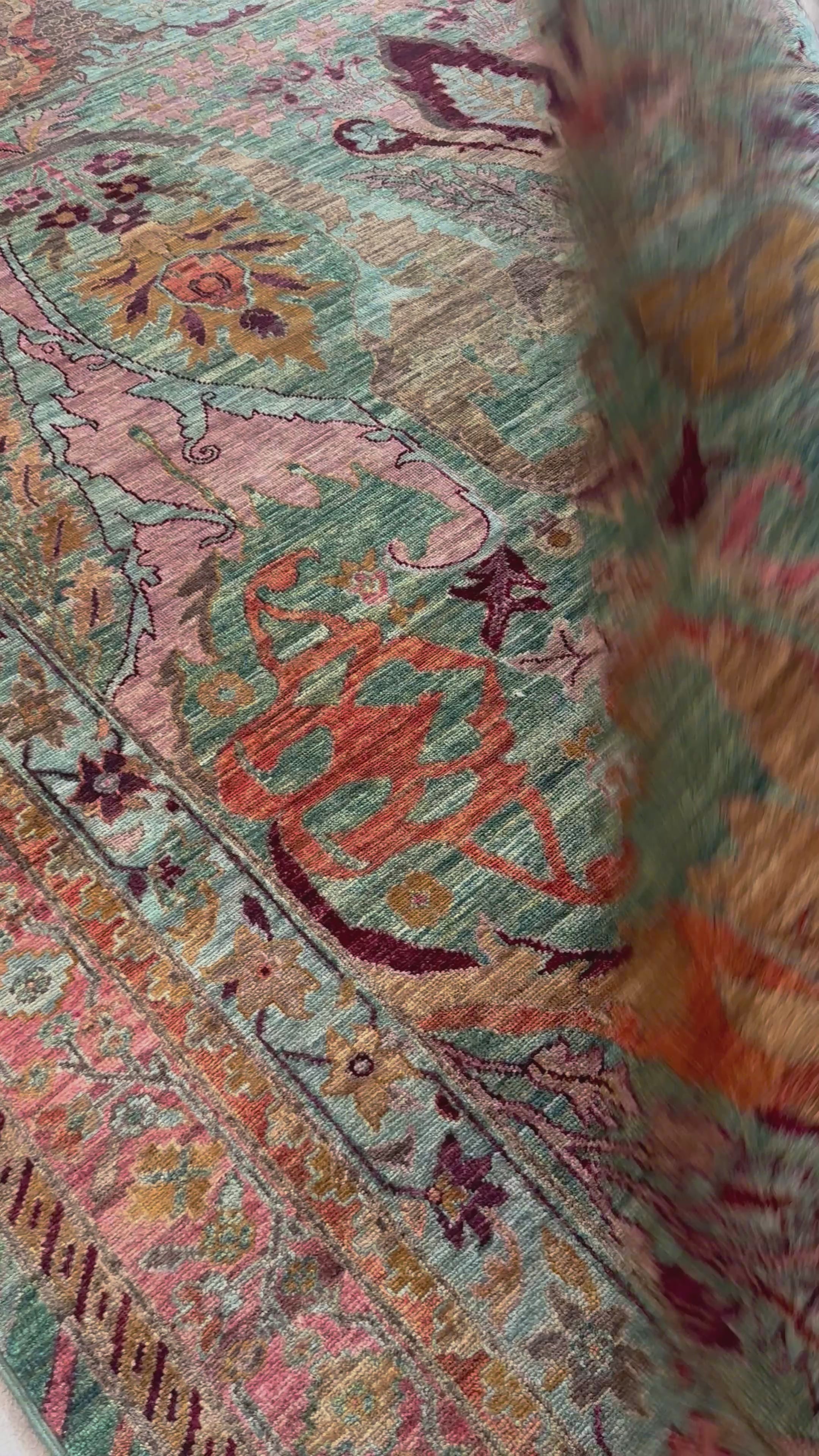 Verdant Harmony is a handmade treasure, crafted from the finest wools of Pakistan and New Zealand. Its soothing jade-green backdrop sets the stage for a vibrant interplay of gold, coral, plum, and rose motifs — each symbolizing renewal, beauty, and abundance. The design, inspired by centuries of Persian artistry, is alive with floral medallions and mirrored symmetry, evoking the gardens of ancient empires.